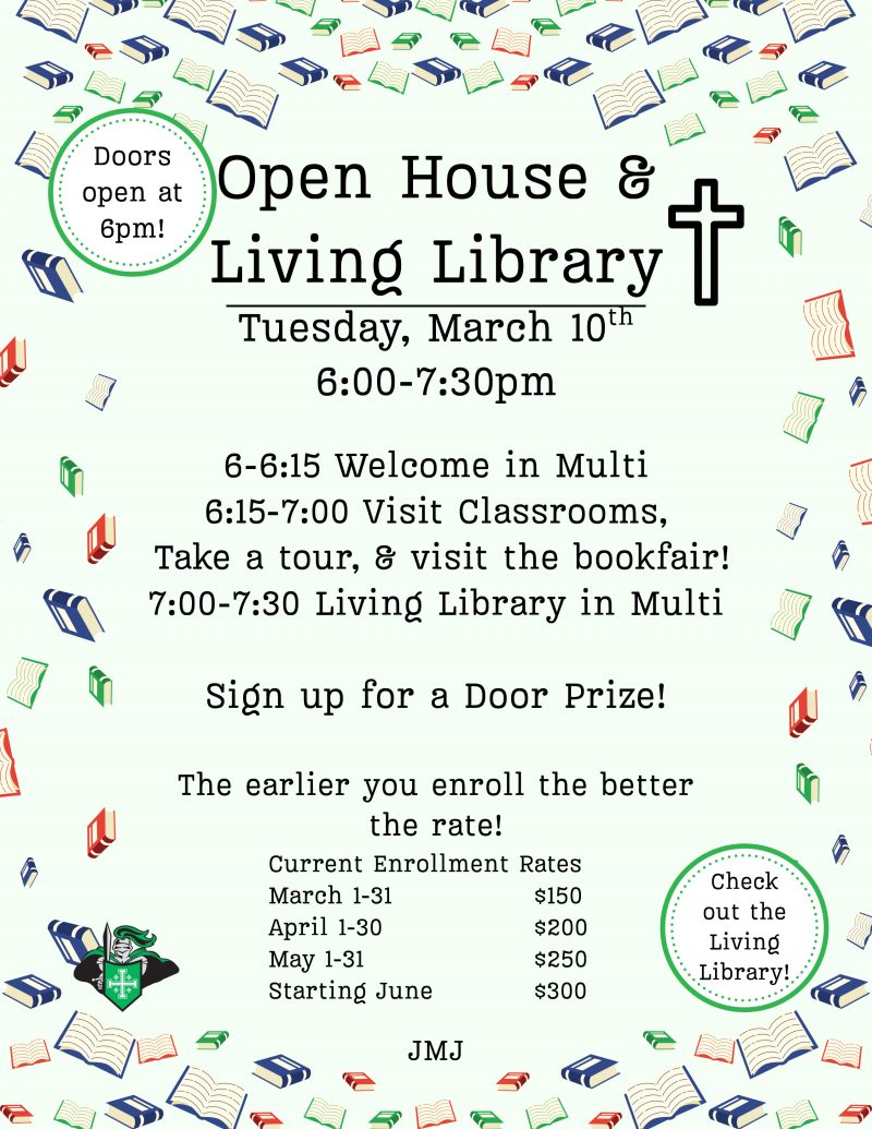 Please join us on Tuesday, March 10th from 6-7:30pm at Holy Name Catholic School for an Open House and Living Library! Meet our Staff, visit our classrooms, tour our school, browse our Book Fair, and enjoy our Living Library! Enrollment and registration will be available with onsite assistance or directions on how to enroll online at your own convenience. Even if you’re not interested in enrolling, please feel welcome to join us at our Book Fair and Living Library! It’s a fun, family event open to everyone!