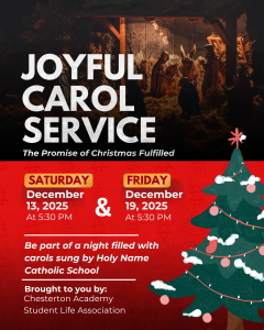 Please join us for our first Annual Joyful Carol Service sponsored by the Student Life Committee on Saturday, December 13, 2025 and Friday, December 19, 2025! We will meet at the HNHS – A Chesterton Academy at 5:30pm. Caroling booklets and a map will be provided. We will be caroling for local shut-ins and nursing facilities. Please dress warmly! RSVP to Katie DeGrand at 906-280-6763.